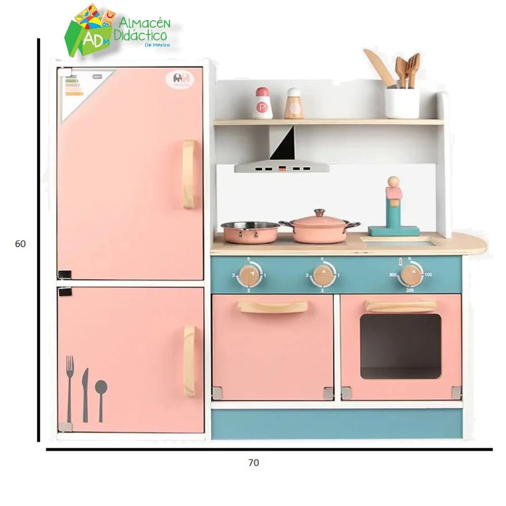 Cocina con refrigerador para niños. Excelente set de cocina para actividades recreativas como habilidades de motricidad e imaginación de los niños. El juego incluye accesorios. Medidas: Alto 60 x Ancho 70 cm.