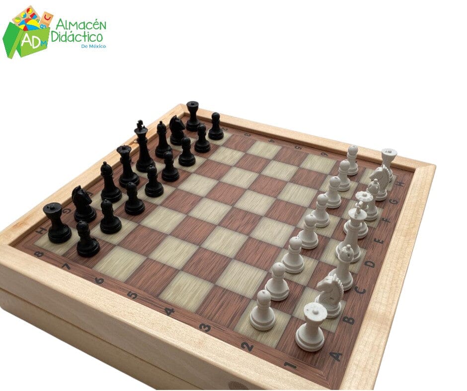 Contiene: 1 set de ajedrez, 4 fichas de colores de plástico, 1 dado, 10 fichas de madera.