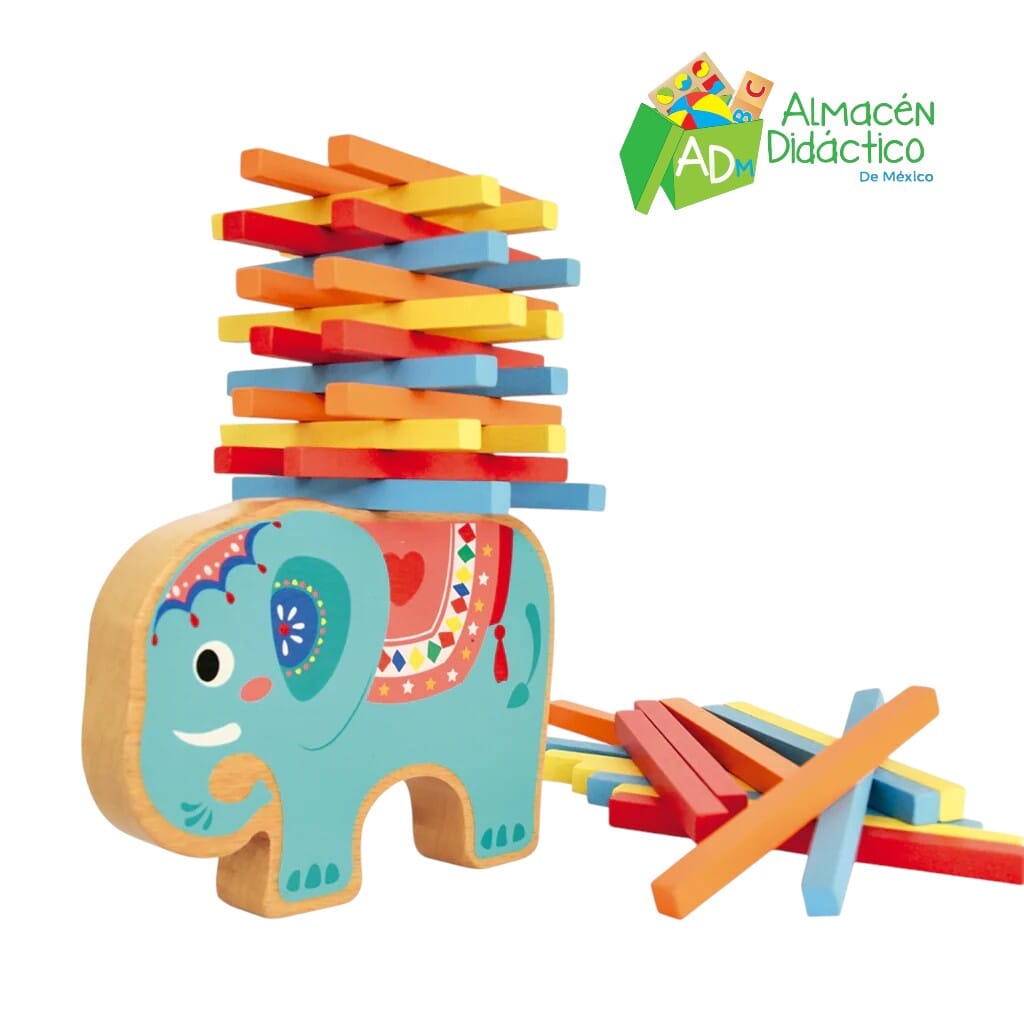 Juego de madera que consiste en armar una torre sobre el elefante, cada jugador elegirá un color y deberá ir colocando los bloques de dos en dos sobre la espalda del elefante evitando que caigan.