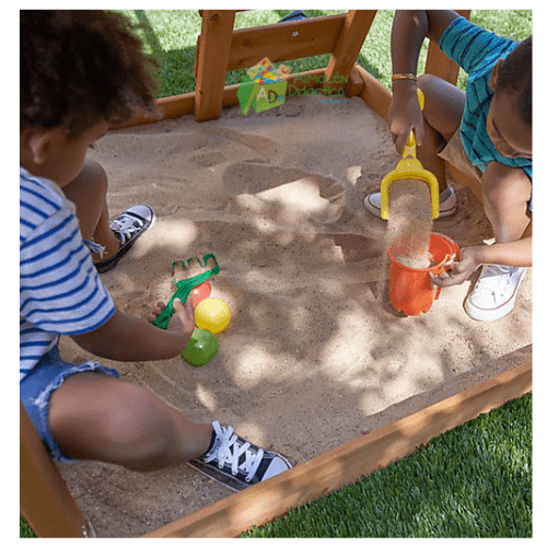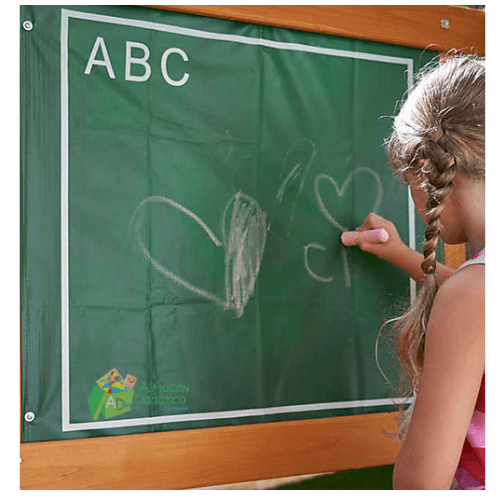 Este juego de exterior incluye dos columpios , tobogán, pared de roca para escalar y casita con sombra en el nivel superior. Además de pizarrón para gis.