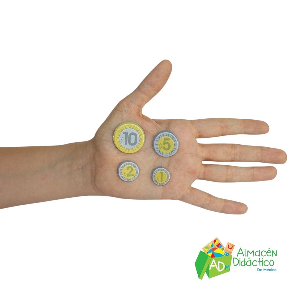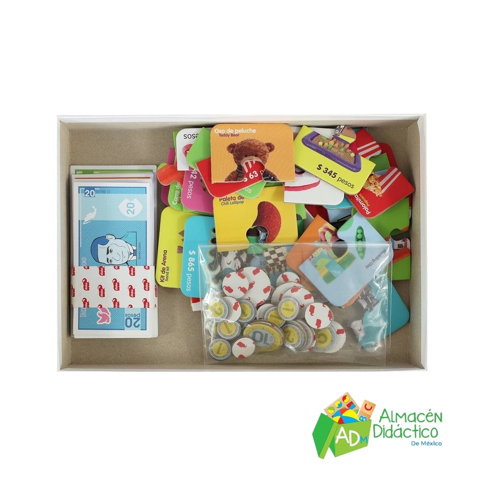 ¡El juego de la tiendita incluye tarjetas con imágenes de productos, billetes y monedas mexicanas!