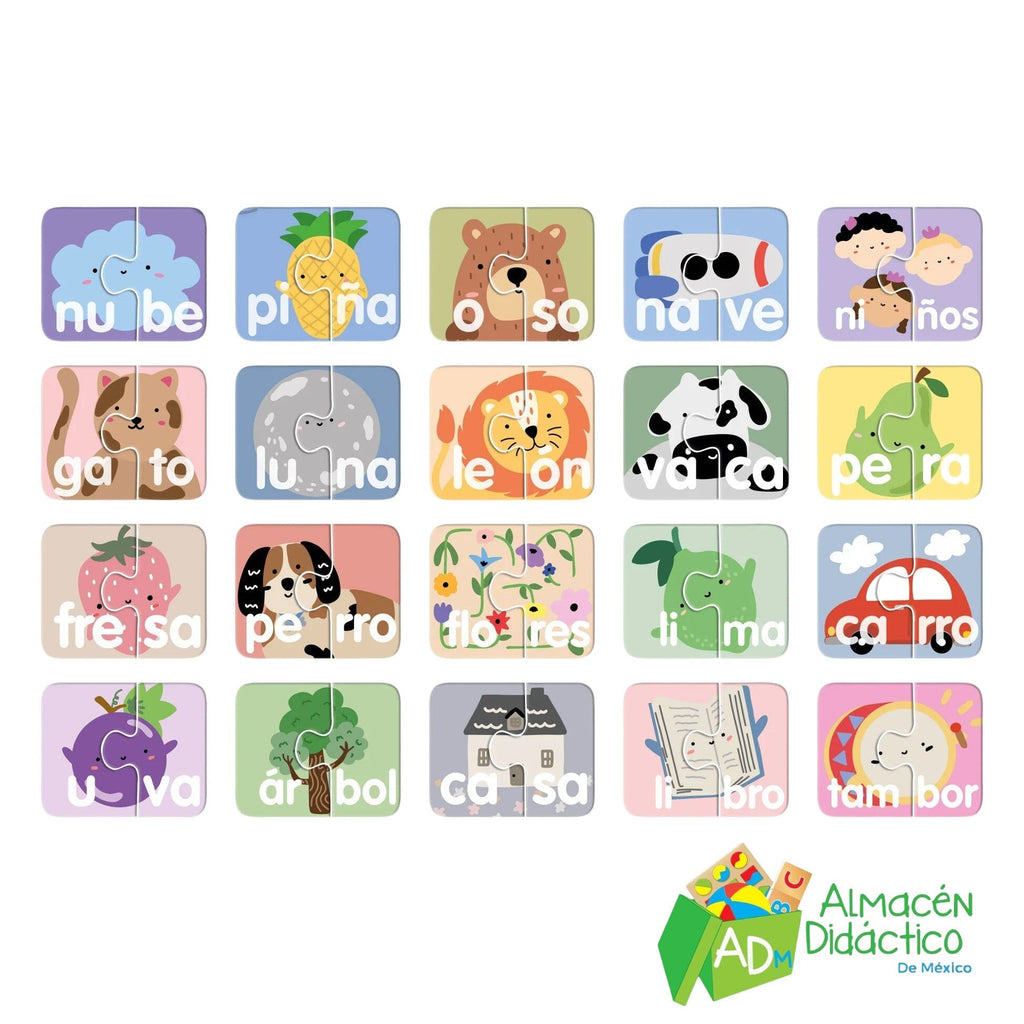 Tarjetas de cartón en forma de rompecabezas que ayudan al aprendizaje de la lectura, desarrollan el lenguaje y la concentración, asociación y atención.