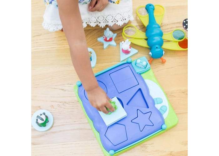 Psst ... ¡Están aprendiendo! Enseña formas básicas Desarrolla habilidades matemáticas tempranas mediante clasificación y combinación Practica la motricidad fina Ir al grano Juguete de clasificación para niños pequeños basado en la canción infantil ''Animales saltando en la cama’’.