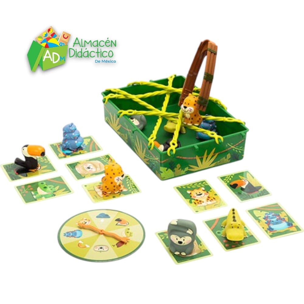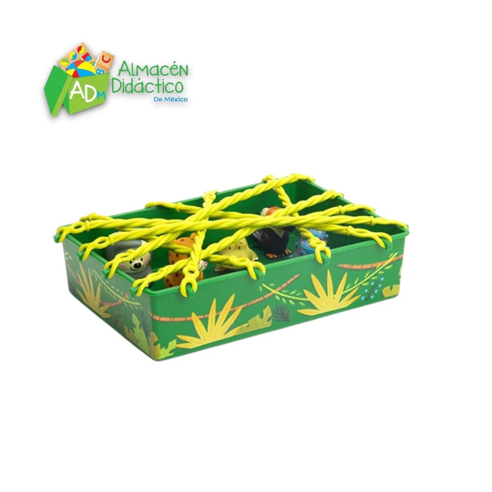 Contiene: una pinza, un contenedor de juego, 8 lianas ,10 tarjetas, 10 animalitos, una ruleta